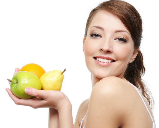portrait of laughing happy young woman with fruits